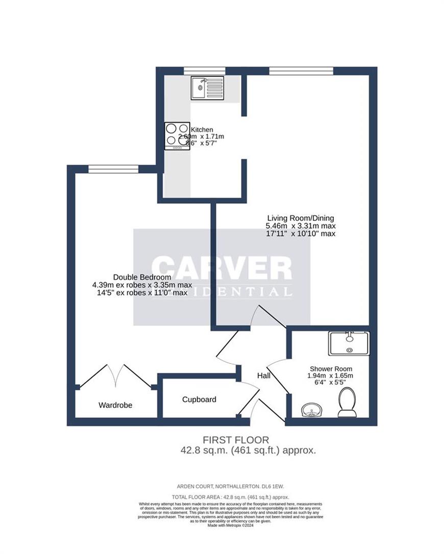 A spacious and well appointed one double bedroomed first floor apartment located within a purpose built retirement development close to Northallerton High Street. The property has electric heating and double glazing and the accommodation includes a reception hall with large storage cupboard, spacious living room / dining room which over looks communal garden, fitted kitchen with integrated oven and hob, double bedroom with built in wardrobe and a refurbished shower room / wc with shower cubical, wc and sink with vanity units below.