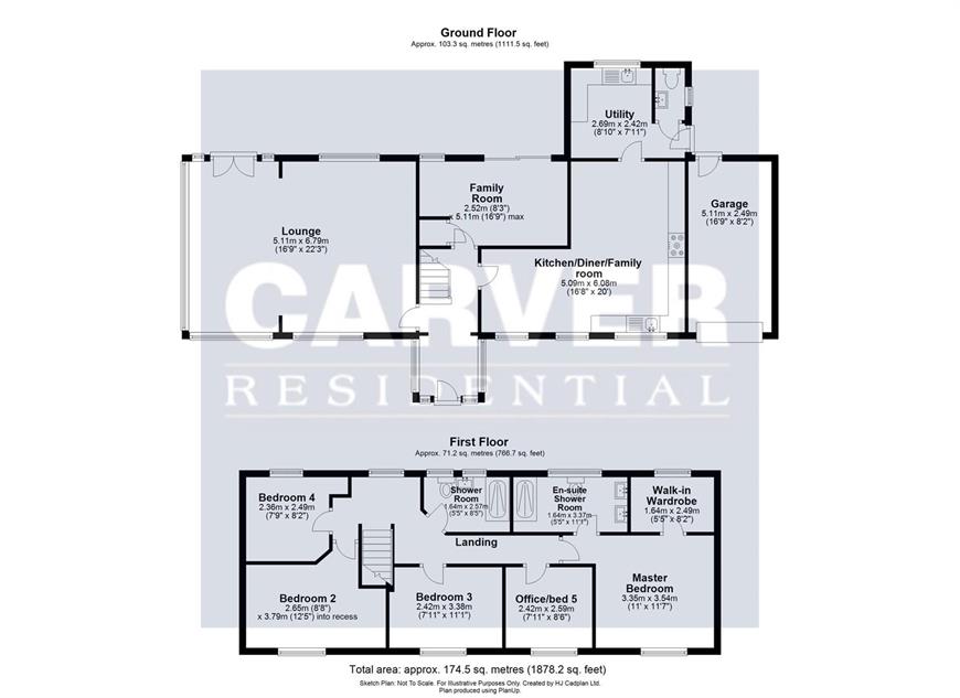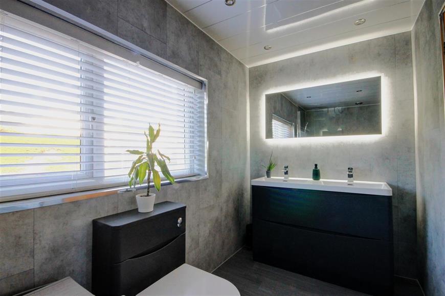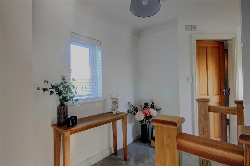 The first floor features a stylish family shower room, complete with a double-width rainfall shower, W/C, and a vanity unit with wash basin. A long landing provides access to five well-appointed bedrooms, including the spacious master suite, boasying a walk-in wardrobe and a beautiful en-suite shower room with a double-width rainfall shower, W/C, and twin sinks. Bedroom five is currently set up as a home office, ideal for those who work from home.