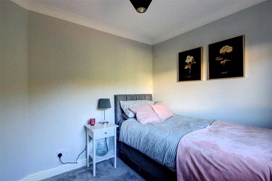 Externally, the property includes a garage with power and lighting, as well as a two-car driveway. The front garden is enclosed by leylandii hedging and wraps around the property, offering access to the generously sized rear garden. The outdoor space features a decking area with steps leading to a two-level lawn, also enclosed for privacy, making it perfect for outdoor activities or quiet relaxation.