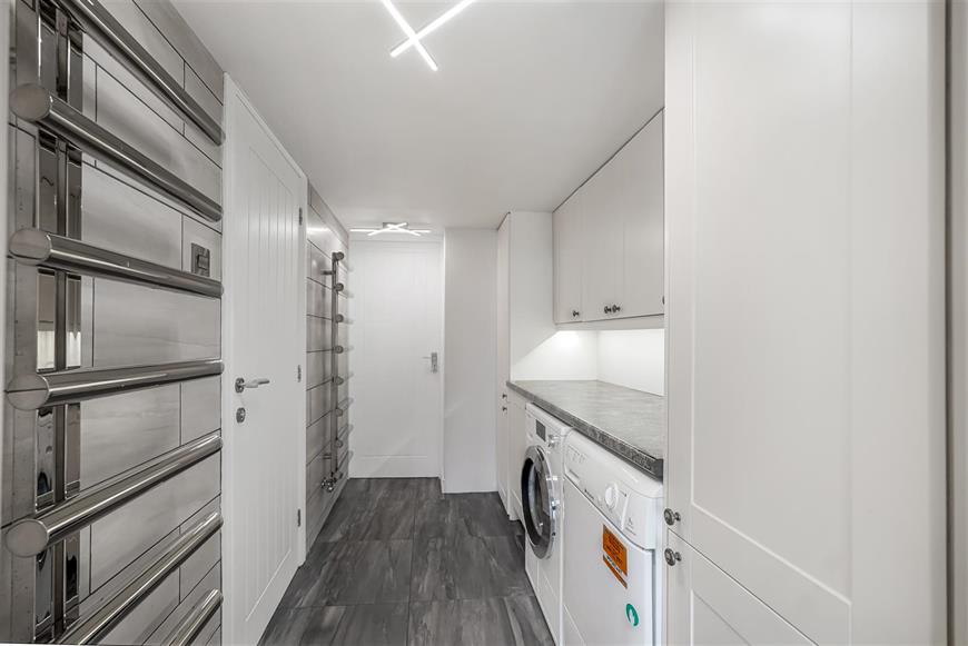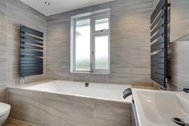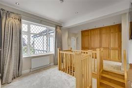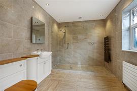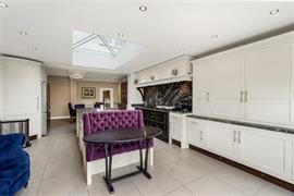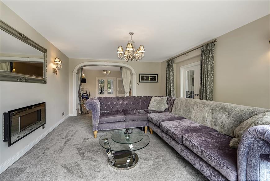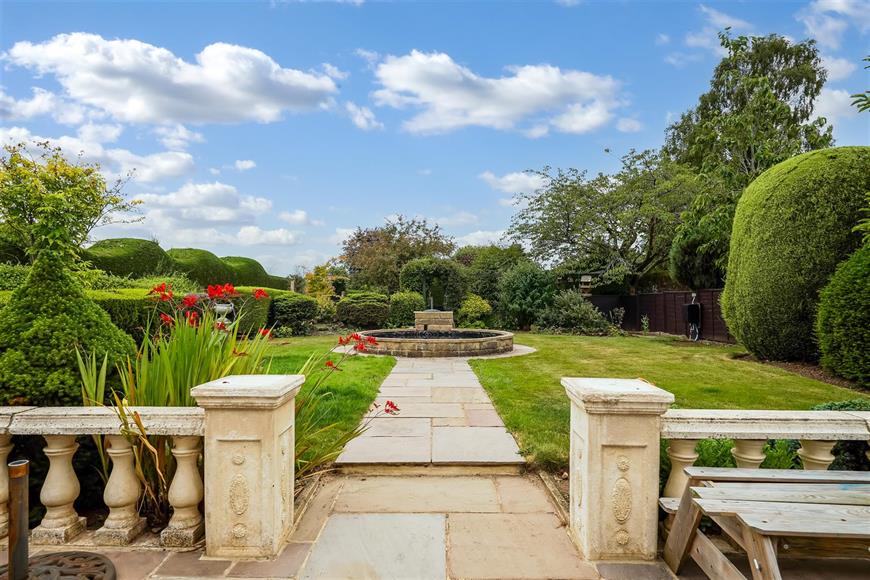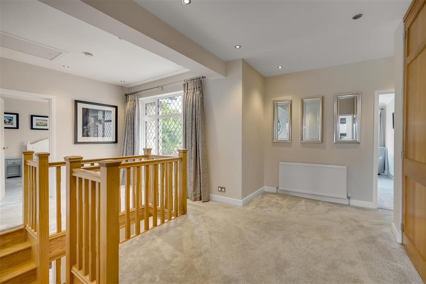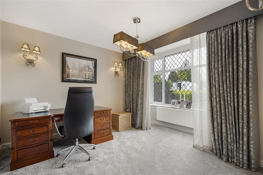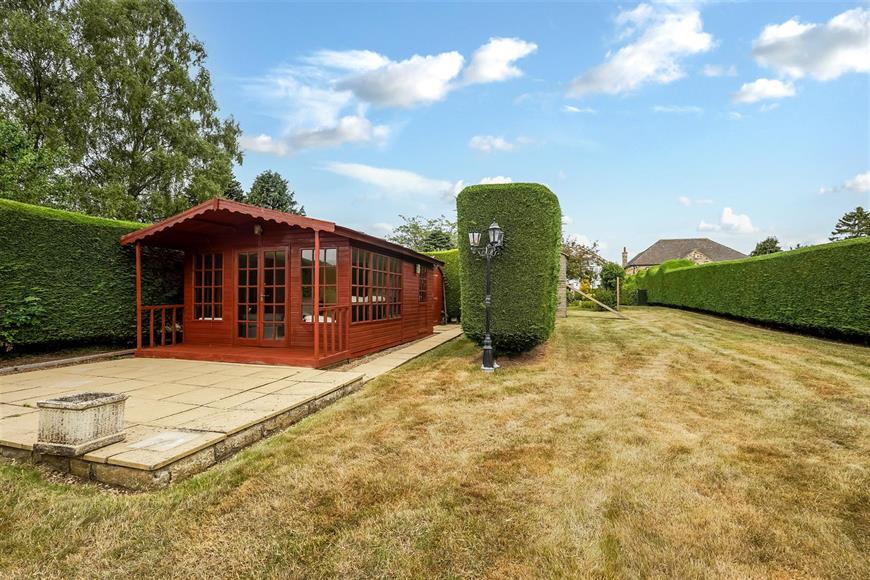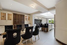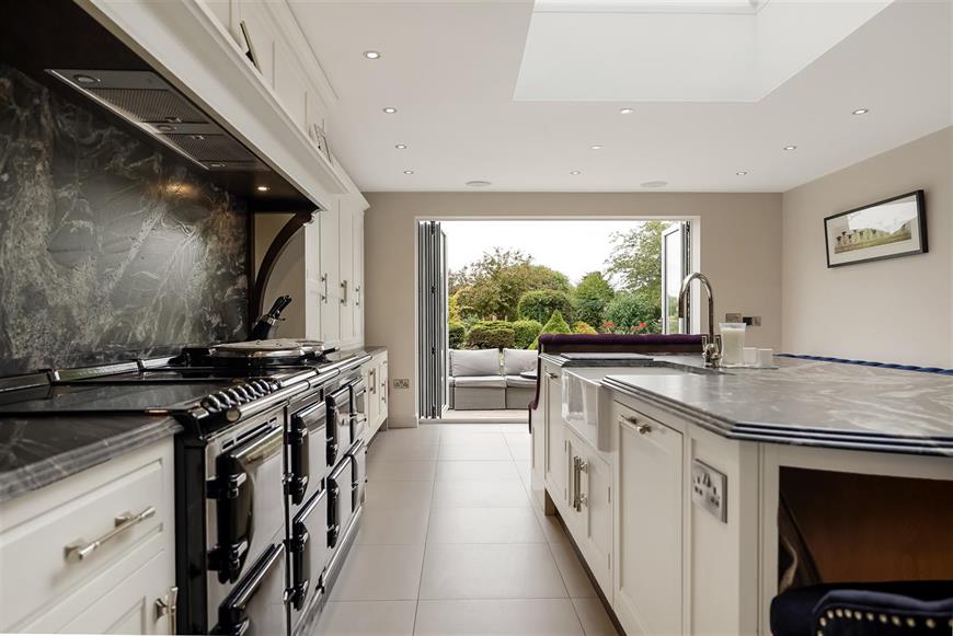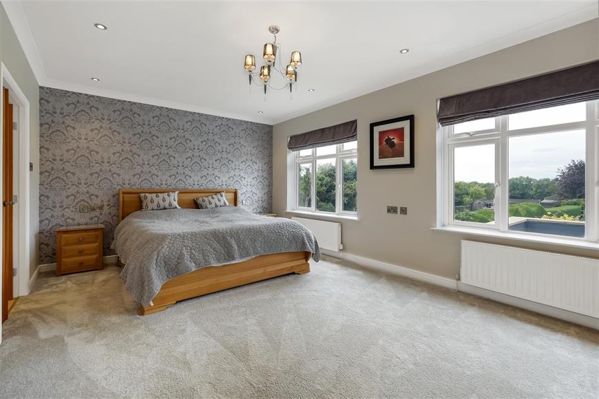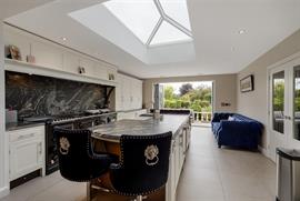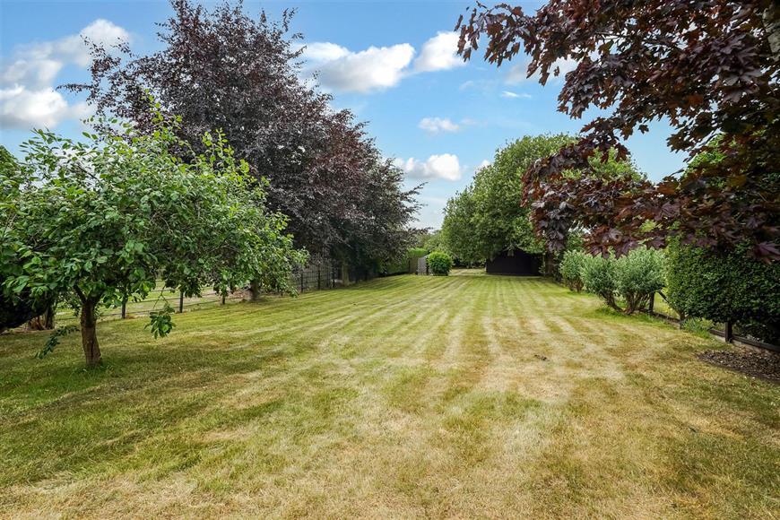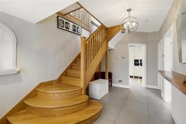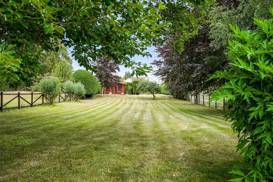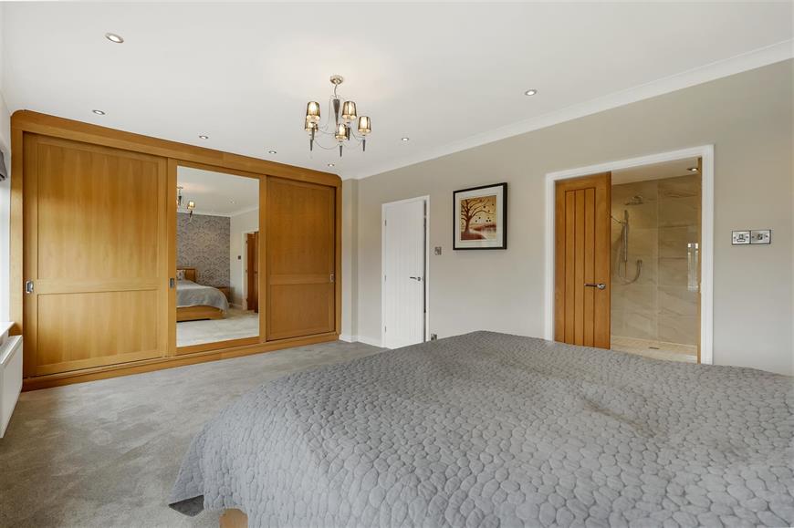 The welcoming hallway leads you into two elegantly designed reception rooms that are ideal for both relaxation and entertaining, also having the added advantage of a study room perfect for working from home. The heart of the home is undoubtedly the impressive bespoke Treske open-plan kitchen and breakfast area featuring high spec fittings, Miele appliances and a stunning central island with granite worktops and waterfall edges. Large doors open to the expansive south-facing rear garden, seamlessly blending indoor and outdoor living while offering breathtaking countryside views. The bespoke oak staircase takes you to the first floor and large galleried landing leading to the master bedroom, complete with Treske oak wardrobes and en-suite bathroom. Four additional bedrooms provide ample space for family or guests, complemented by a stylish main house bathroom and additional shower room both with Villeroy and Boch fixtures. The rear garden is perfect for family gatherings or simply enjoying the tranquility of nature, with mature, varied gardens, seating areas, well stocked flowers, shrubs and summerhouse,Also having the benefit of stables.