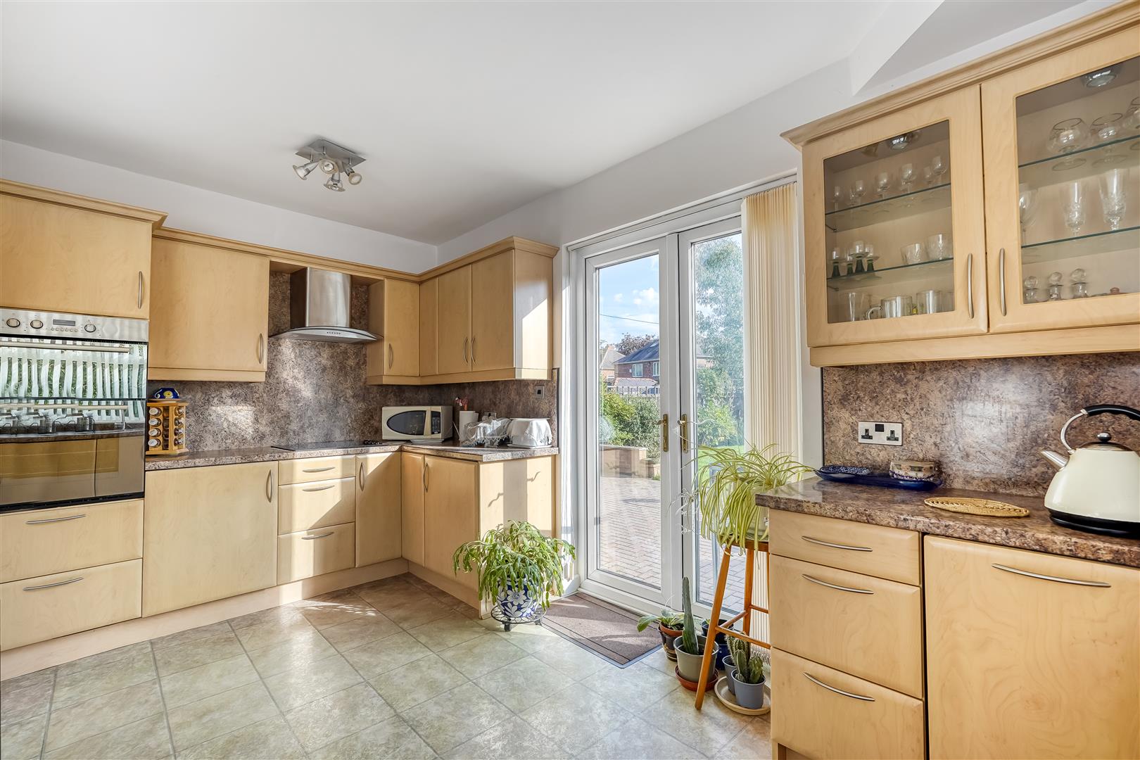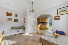 The welcoming hallway leads to a generous living room, ideal for relaxation with a separate dining room providing an excellent space. The fitted kitchen, complete with integrated appliances, has French doors leading to the rear garden.