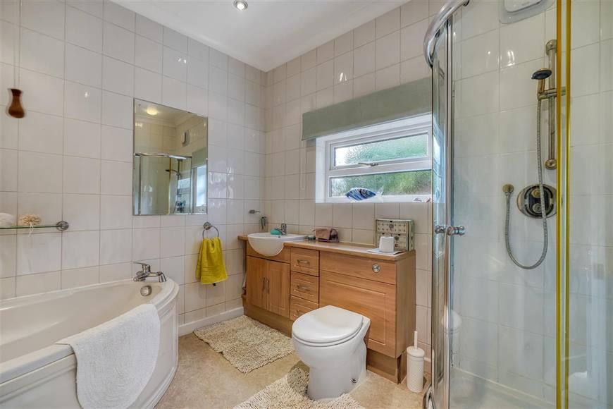 This bungalow features two well-proportioned double bedrooms, one with fitted wardrobes, ensuring ample storage. The bathroom is thoughtfully designed, offering both a separate walk-in shower and a bath. There is also access to the loft via a drop-down ladder providing extra storage.