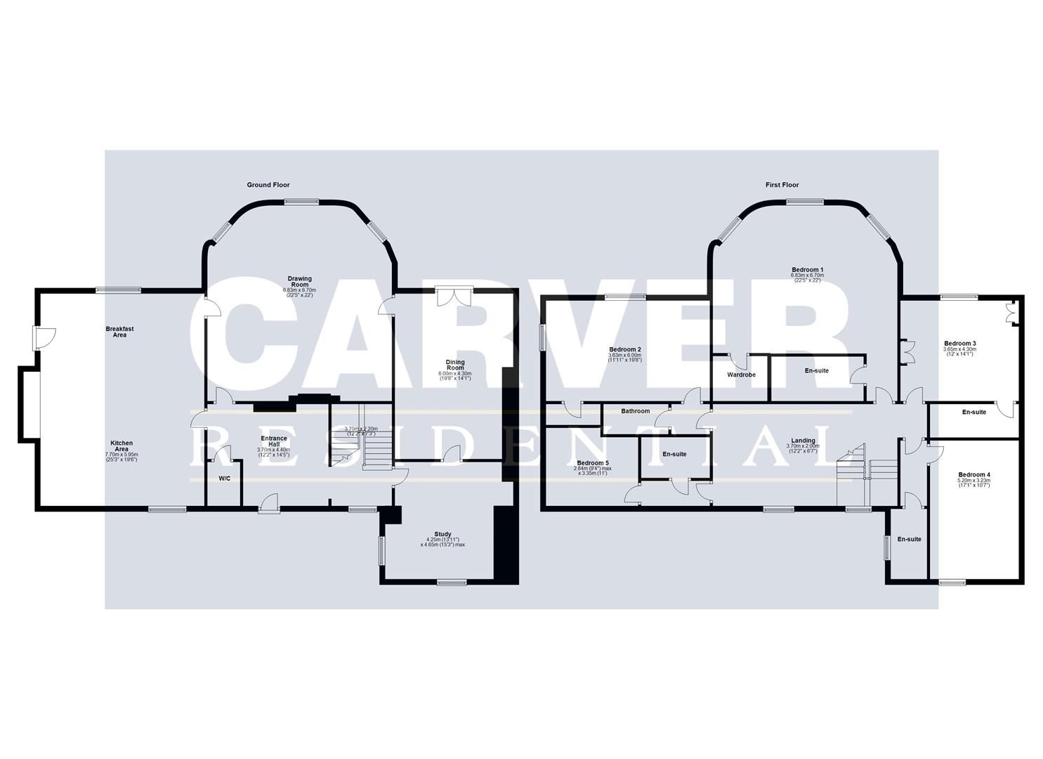 On the first floor 5 generous bedrooms, each with it's own bathroom. A master suite directly above the formal lounge enjoys the huge bay window looking over the grounds with ensuite and walk in robe. 3 Further bedrooms with ensuite, with the 5th bedroom utilising the family bathroom.
