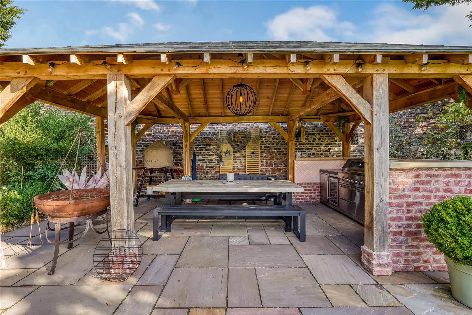 To the outside the property boasts a double garage and ample parking for more vehicles, a rare find adding to the convenience of this residence. Multiple seating areas around the garden, the best of which an impressive recent addition, the outdoor kitchen pagoda!! Fully equipped for entertaining.