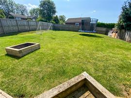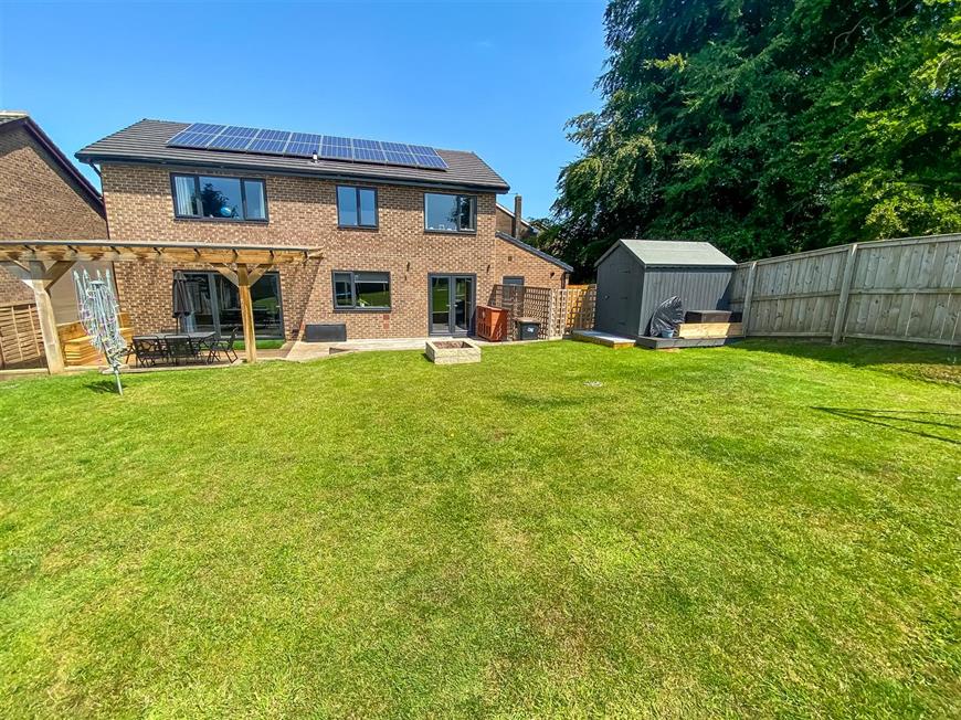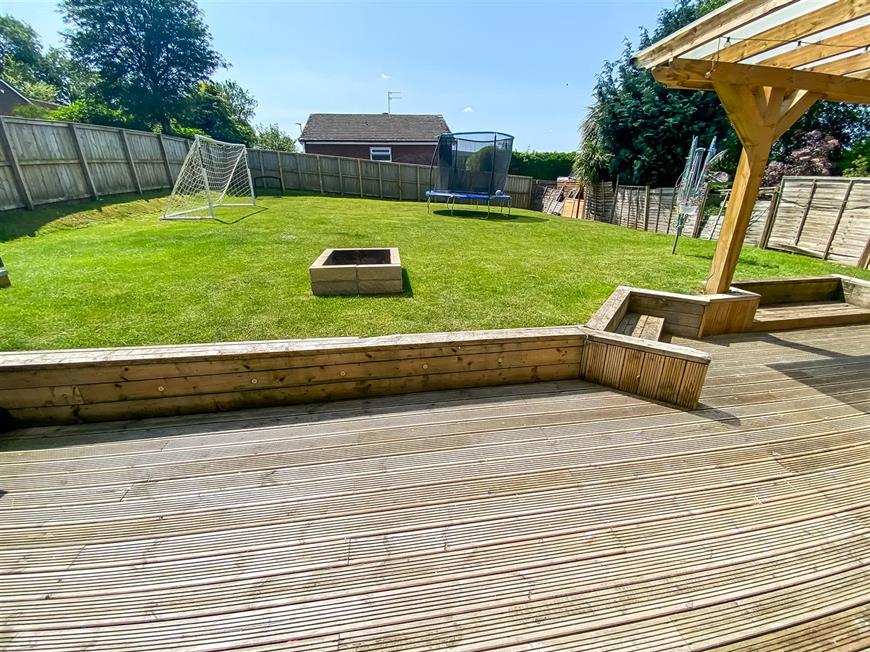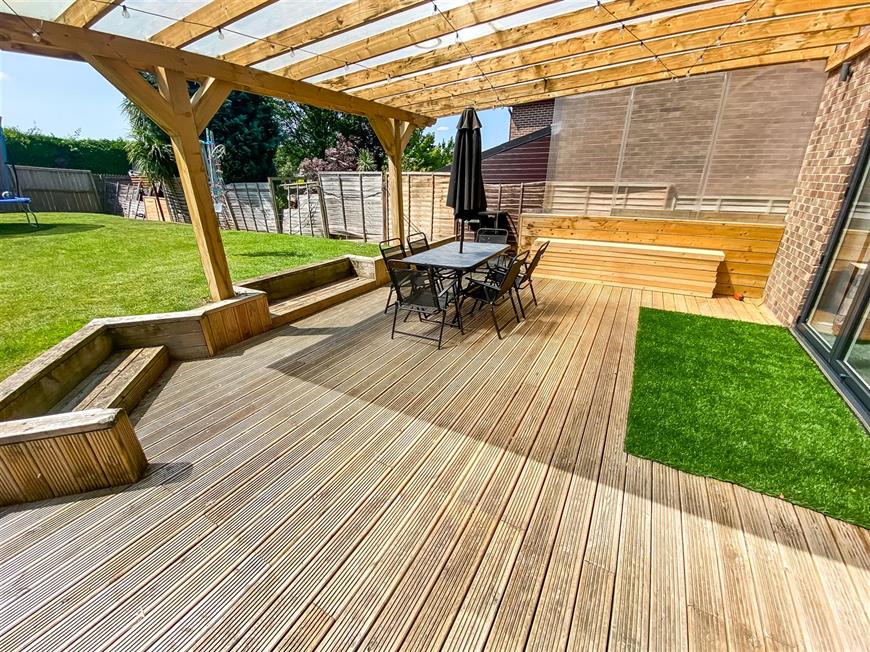 Outside, the expansive rear garden features a lush lawn and a charming wood-decked area with pergola, ideal for summer barbecues or simply enjoying the outdoors. The driveway leads to an attached double garage, providing parking for up to six vehicles, a rare find in residential properties.