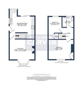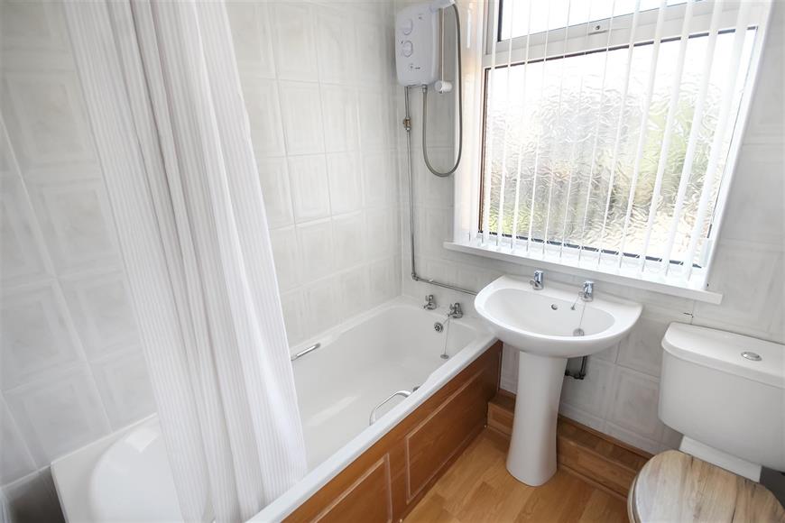 The first floor comprises a landing area that leads to two generously sized bedrooms, ideal for restful nights. The bathroom is equipped with a modern white suite and an overhead shower, ensuring convenience for all residents.