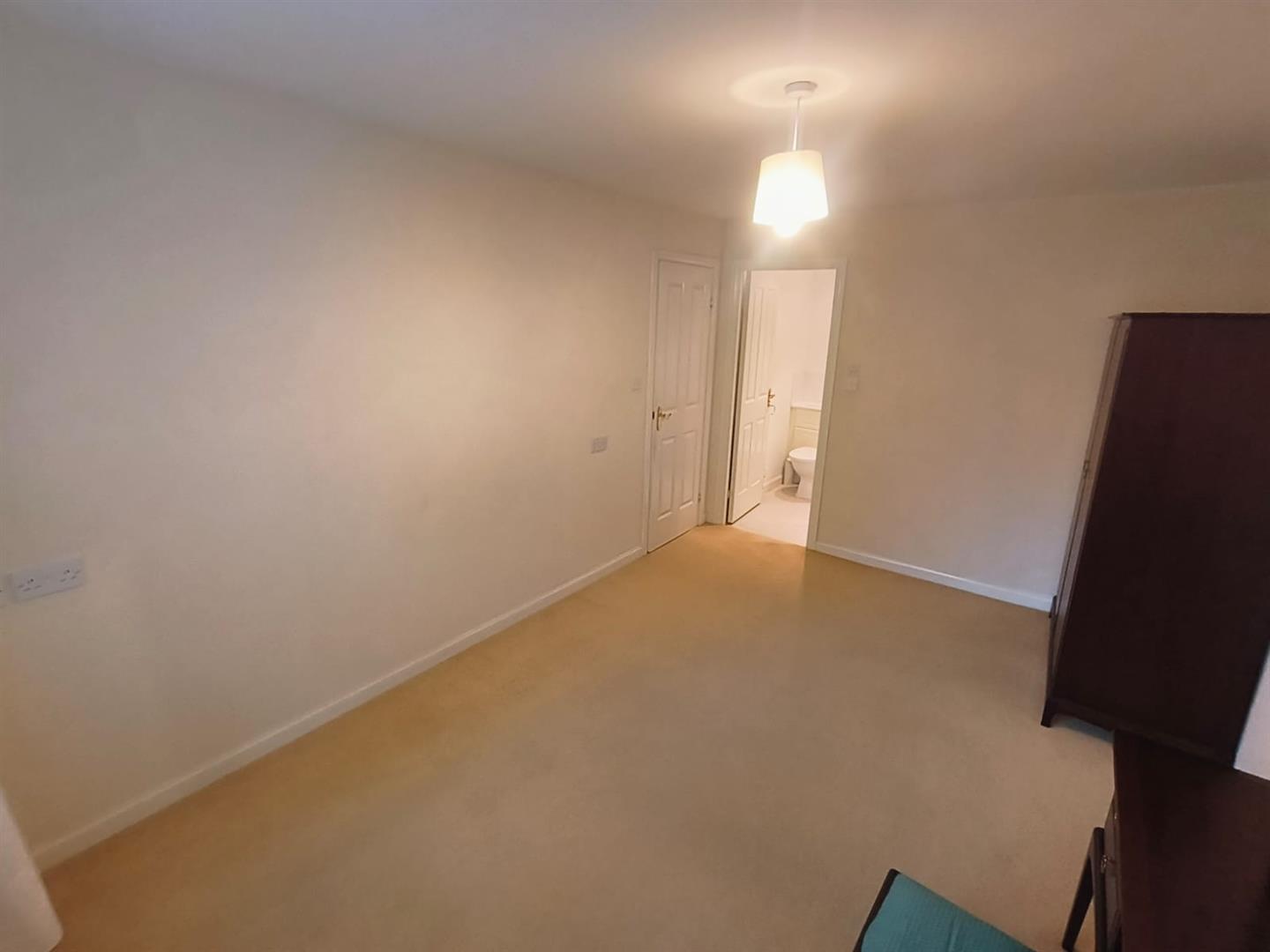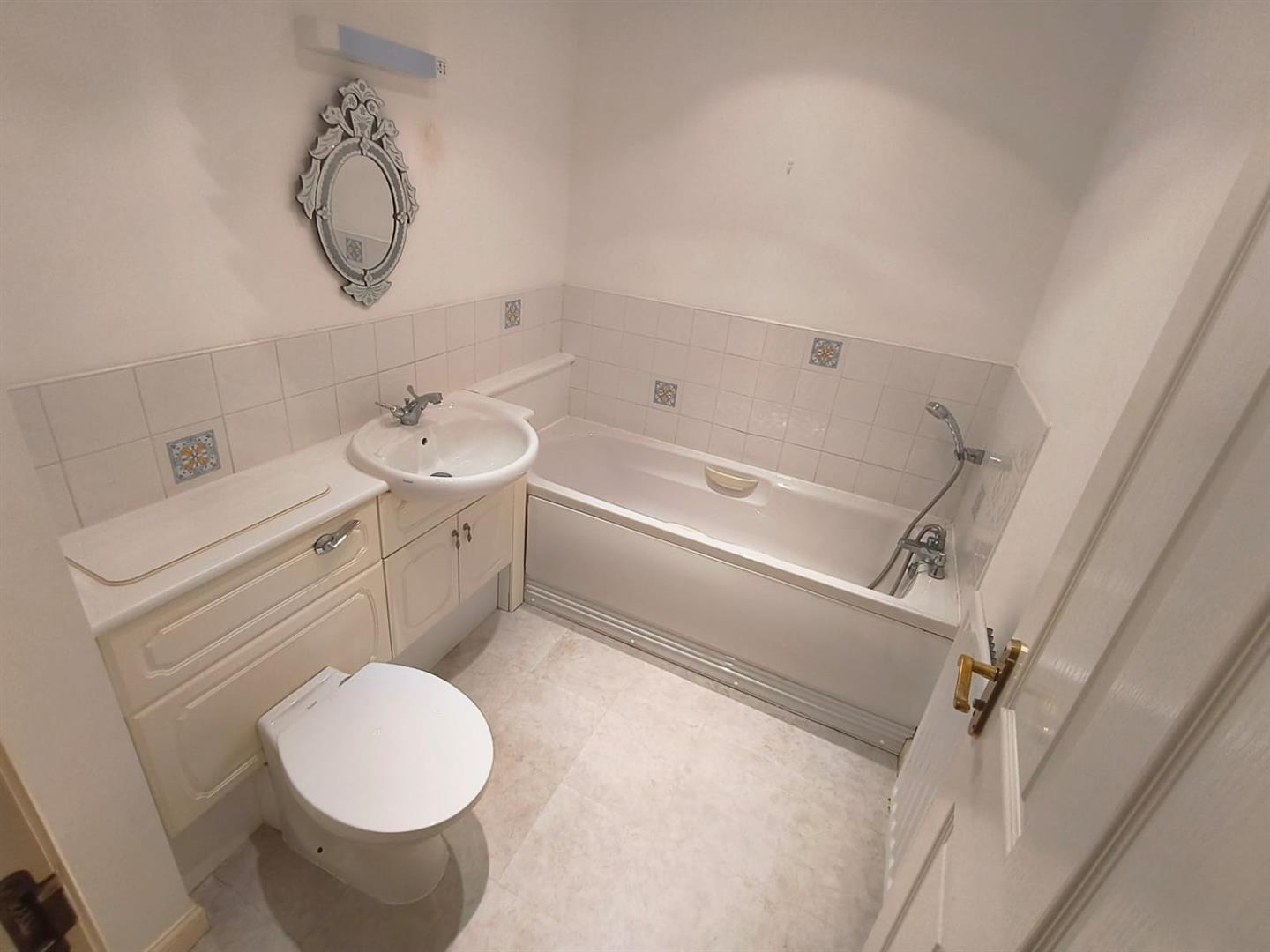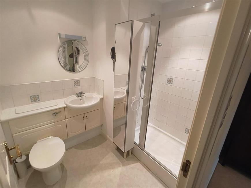 The apartment comprises two generously sized bedrooms, including a master suite with an ensuite shower room. This private space is fitted with a modern suite, including a shower cubicle, wash hand basin, and low-level WC, all designed for convenience and comfort. The second double bedroom is equally inviting, while the family bathroom features a panelled bath with an overhead shower, ensuring ample facilities for all.