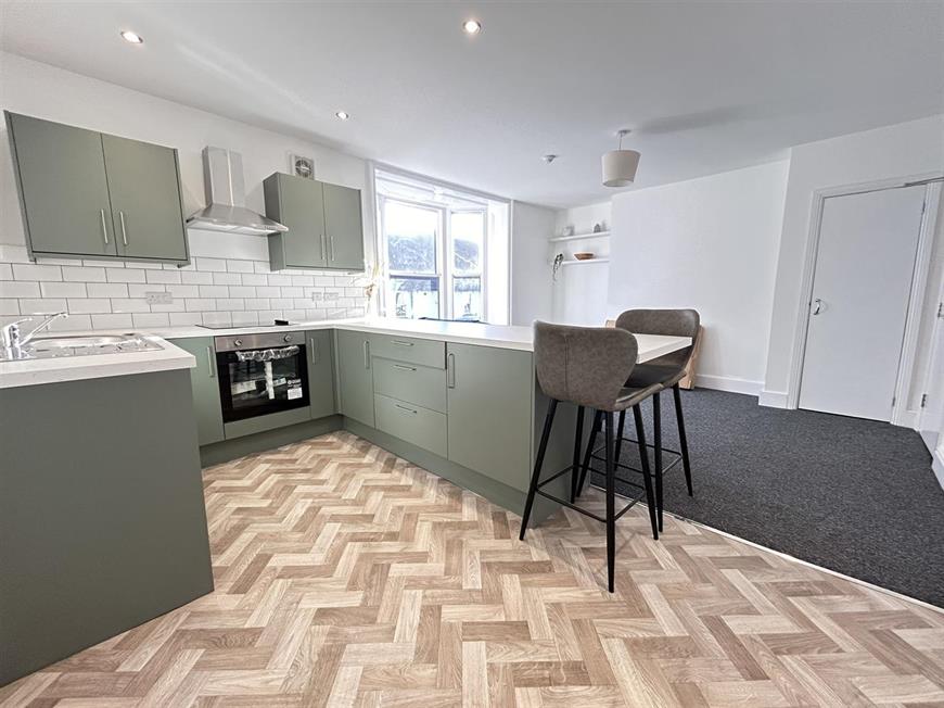 Upon entering, you will be greeted by a bright and airy open plan living room and kitchen, featuring elegant bay windows that allow natural light to flood the space. The kitchen is equipped with contemporary fittings and a breakfast bar, making it an ideal spot for casual dining or entertaining guests.
