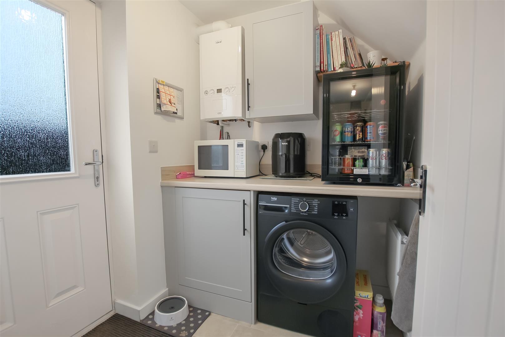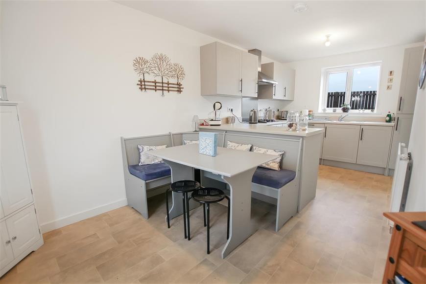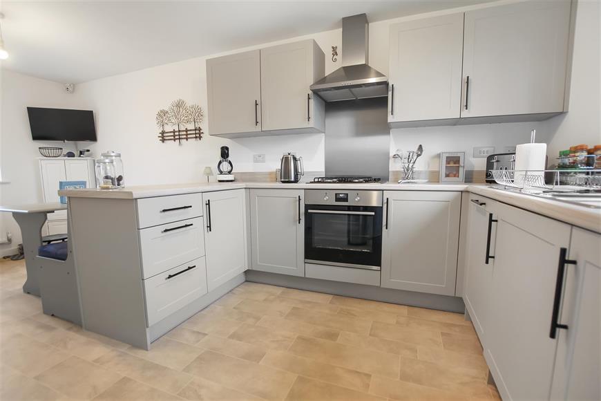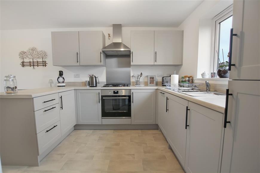 A modern three bedroomed detached family home providing spacious and well appointed living accommodation accessed via a shared private road and located on a popular modern development on the outskirts of Northallerton and having views over countryside to the rear. The property benefits from gas fired central heating and Upvc double glazing. The accommodation includes an entrance hall, spacious living room with French doors opening to the rear garden. There is an open plan kitchen/dining room with the kitchen area having integrated appliances including oven, hob, fridge, freezer and dishwasher. There is also a separate utility room with integrated washing machine and a ground floor cloaks room/wc. To the first floor there is a master bedroom with built in wardrobes and an en suite shower room/wc. There are two further bedrooms and a family bathroom fitted with a white suite. Externally there is a driveway providing off street parking leading to the garage which has been divided to create a home office/gym and a storage space. There is a rear garden, patio, private decked seating patio and a timber office/bike store.