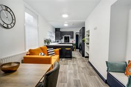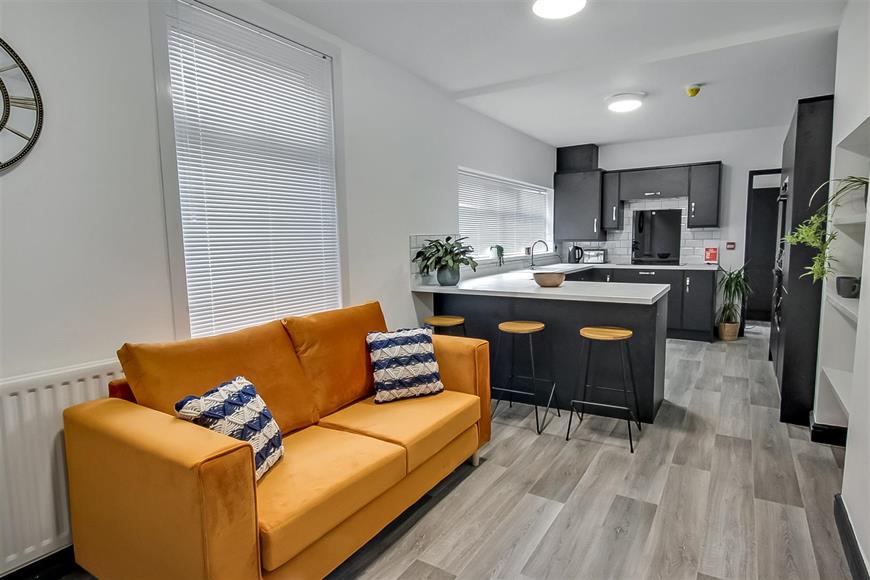 The shared open plan living, dining and kitchen with breakfast bar is the perfect space for those who love to cook or bake with great worktop space, two ovens, five-point hob and two fridge freezers plus plenty of storage space. The seating and dining area, complete with large wall mounted smart TV is the perfect place to relax and get to know your new house mates. There is the benefit of a separate utility/laundry room to the rear keeping the noise and hassle of washing out of the way.